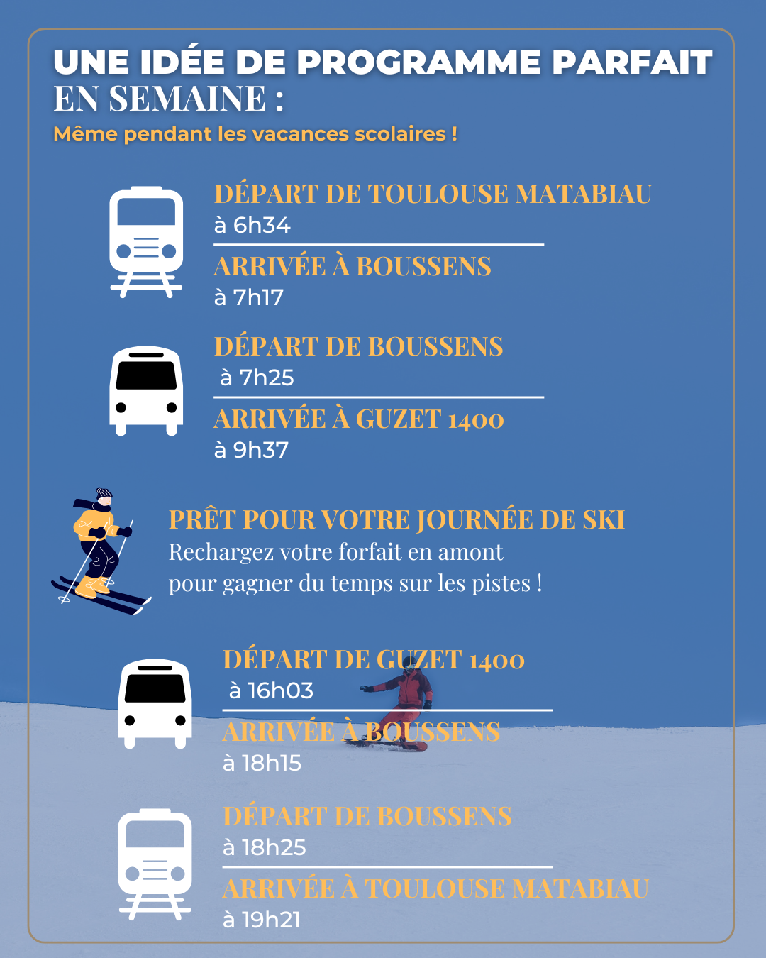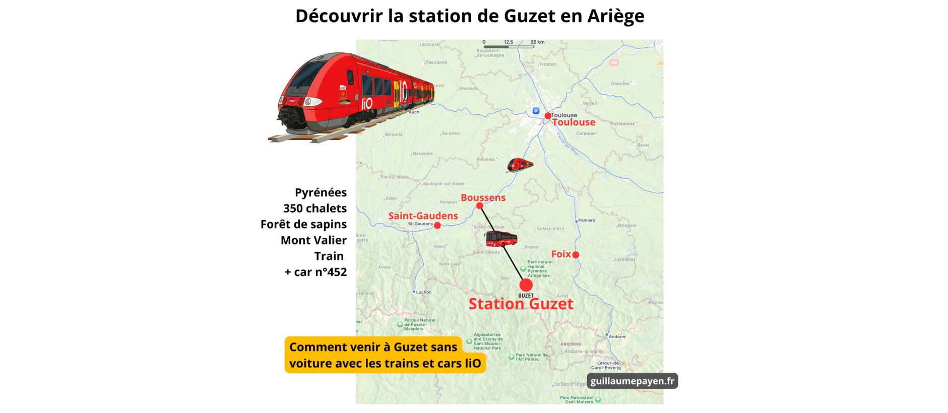 Pour vous rendre de Boussens à Guzet, vous pouvez emprunter ensuite le car liO 452.